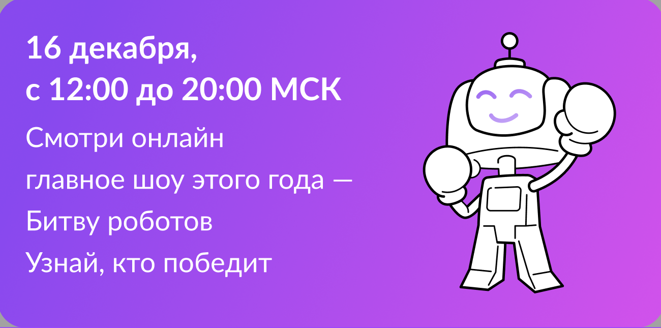 13.12.2023В сентябре и октябре 2023 года прошли два отборочных этапа Чемпионата с участием 58 команд из России, Китая, Турции, Индии и Казахстана.Полуфинал и финал Чемпионата пройдут 16 декабря 2023 г. в г. Москве, в которых примут участие 16 команд из России, Китая, Турции и Индии.Зрителей ждет два шоу (с 11:00 до 20:00 по московскому времени), а также познавательная программа.Цель Чемпионата - привлечь внимание к современным и перспективным технологиям, востребованным направлениям инженерных наук, стать двигателем робототехнического движения и сформировать у участников Чемпионата потребность к получению новых знаний и компетенций.
